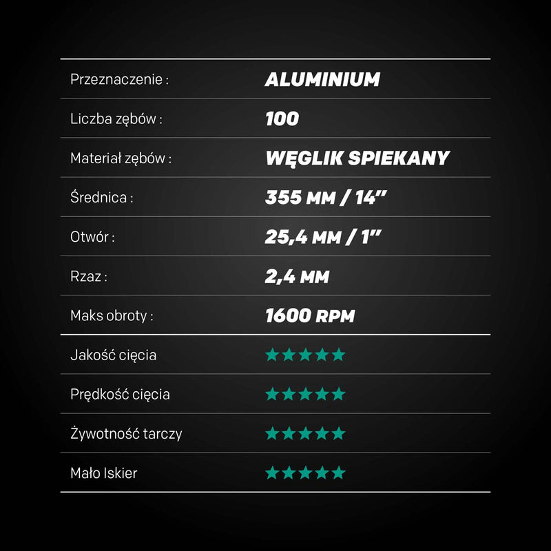 - Żywotność nawet 2x dłuższa niż tarcz konkurencyjnych do aluminium 355 mm. Rezultat: mniej wymian i niższe koszty eksploatacji. Zweryfikowane w certyfikowanych laboratoriach*.