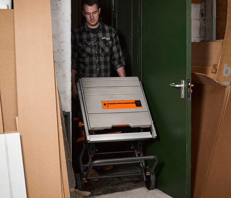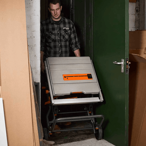 *Wersja R255TBLX jest standardowo wyposażona w nowy stalowy stelaż na kółkach, przystosowany do wszystkich rodzajów terenu. Przymocowany do stołu za pomocą 4 śrub, zapewnia elastyczność, umożliwiając korzystanie z nowej pilarki stołowej jako jednostki zamontowanej na ławce lub na stojaku i umożliwia przełączanie między tymi dwiema opcjami w mniej niż minutę.