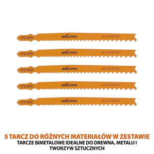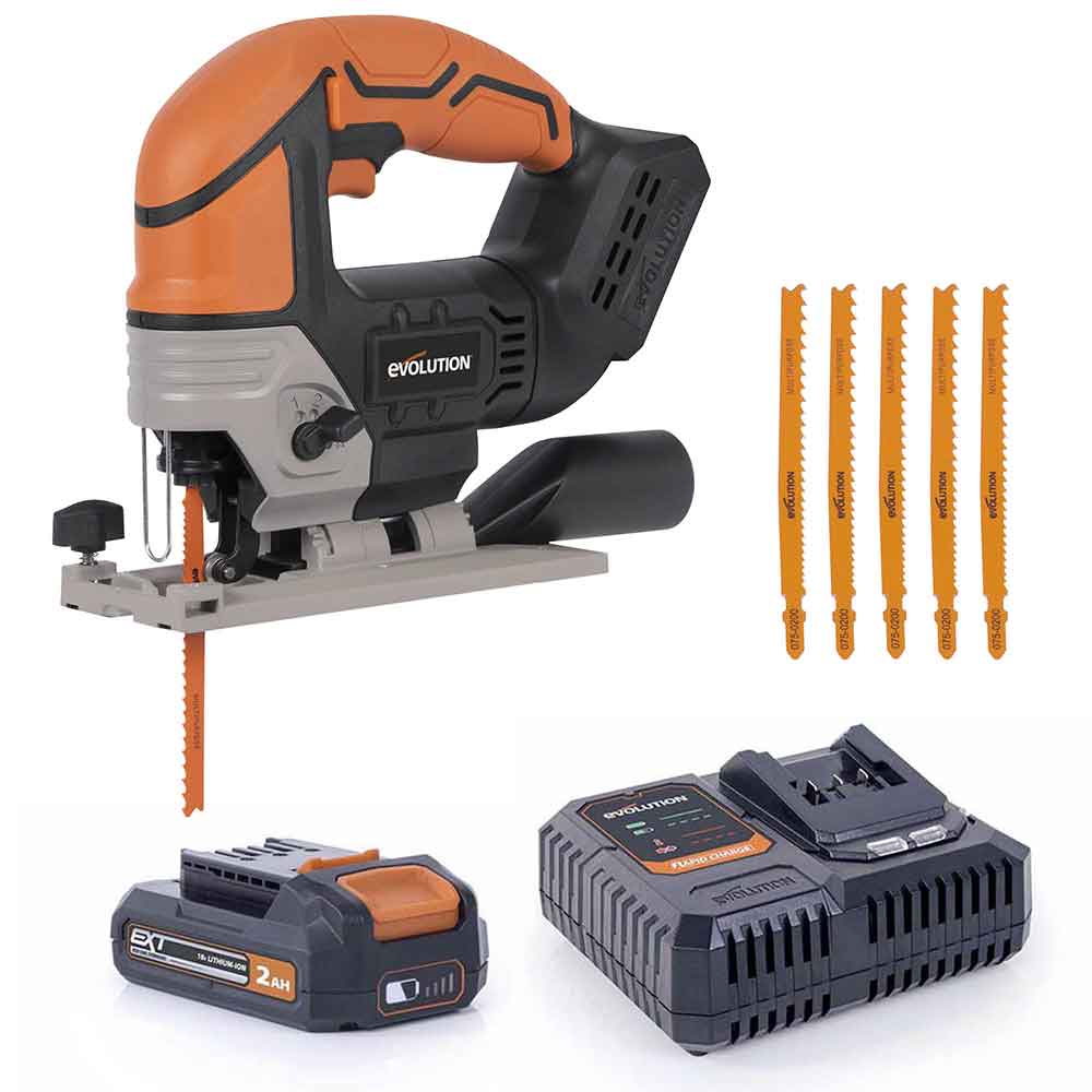 Bezprzewodowa wyrzynarka z akumulatorem litowo-jonowym 18 V EXT Li-Ion R90JGS-Li firmy Evolution z tarczą do cięcia różnych materiałów