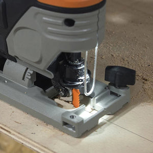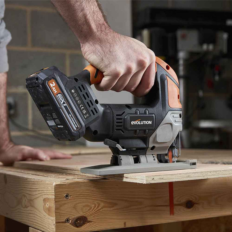 Bezprzewodowa wyrzynarka Evolution R90JGS-Li umożliwia łatwe cięcie materiałów arkuszowych, przecinając drewno do 90 mm, tworzywa sztuczne do 60 mm i stal miękką o grubości 6 mm dzięki mocnemu silnikowi prądu stałego, akumulatorom litowo-jonowym EXT o dużej pojemności i naszej technologii cięcia wielu materiałów.