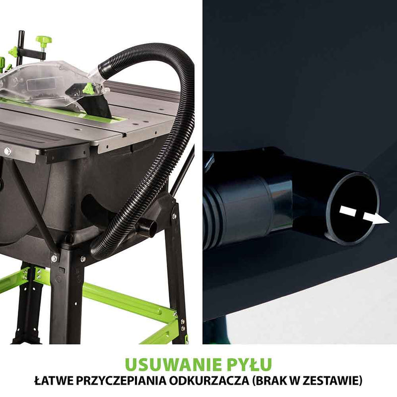 Mocny napęd (S1: 1300 W, S6 40%: 1500 W) o wysokim momencie obrotowym zapewnia płynne cięcie nawet w trudniejszych materiałach. Pochył tarczy 0°–45°, precyzyjna prowadnica równoległa z podziałką, kątowa prowadnica do cięć ukośnych oraz rozkładane poszerzenia stołu ułatwiają pracę z większymi formatami. Zintegrowane porty odciągu pyłu oraz łatwy dostęp do wyłącznika bezpieczeństwa podnoszą komfort i bezpieczeństwo pracy.