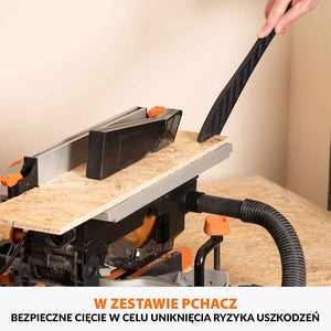 - Konstrukcja 2 w 1 – konwertowalna pilarka stołowa i ukośnica.