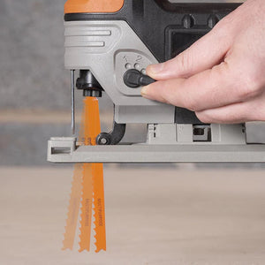 - Wyrzynarka wyposażona jest w beznarzędziowy uchwyt szybkomocujący, który pozwala na bardzo szybki i łatwy montaż lub demontaż brzeszczota. Dołączony do wyrzynarki wielofunkcyjny brzeszczot może ciąć wiele materiałów takich, jak stal, aluminium, drewno i tworzywa sztuczne.
